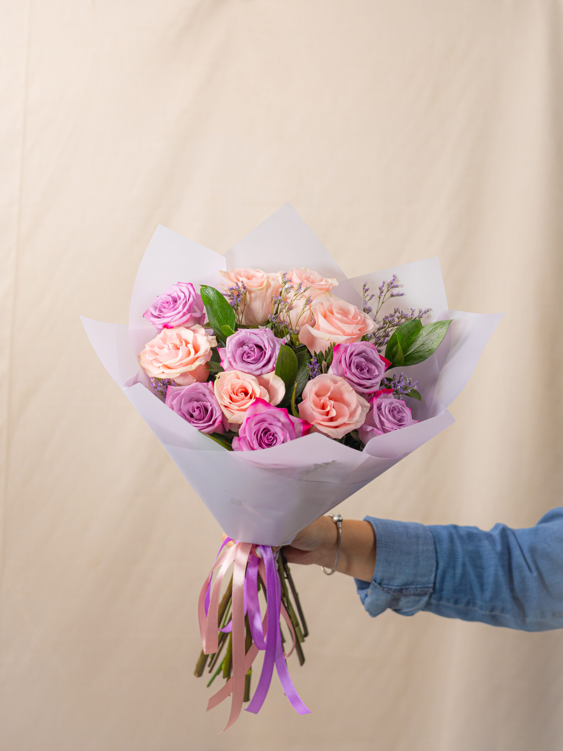 Este ramo está elaborado con una armoniosa combinación de rosas rosadas y moradas naturales, cuidadosamente seleccionadas y envueltas en suaves tonos pastel.