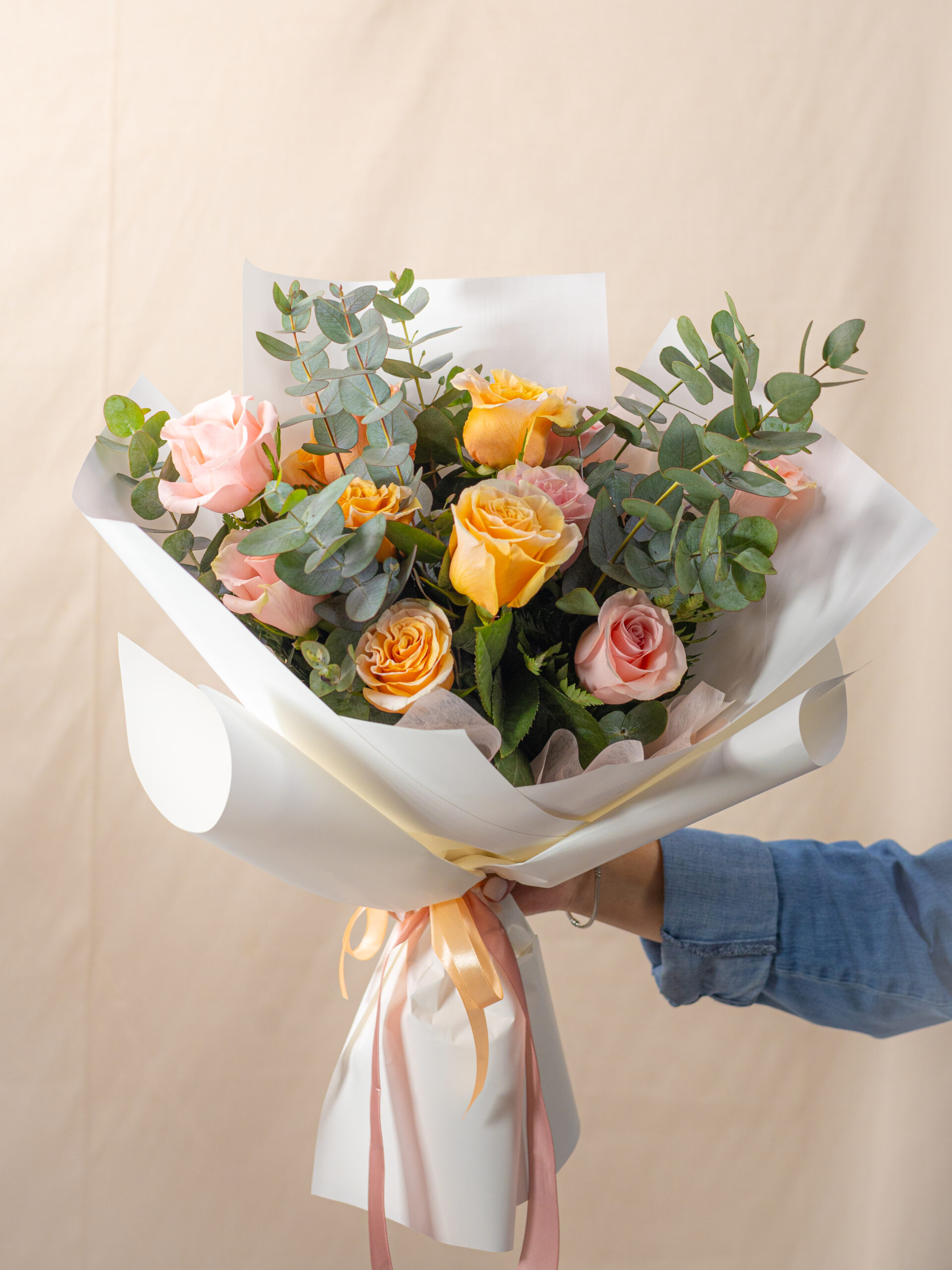 Este ramo está elaborado con una delicada combinación de rosas rosadas y salmón naturales, realzadas con eucalipto fresco que aporta una vibra natural, elegante y atemporal.