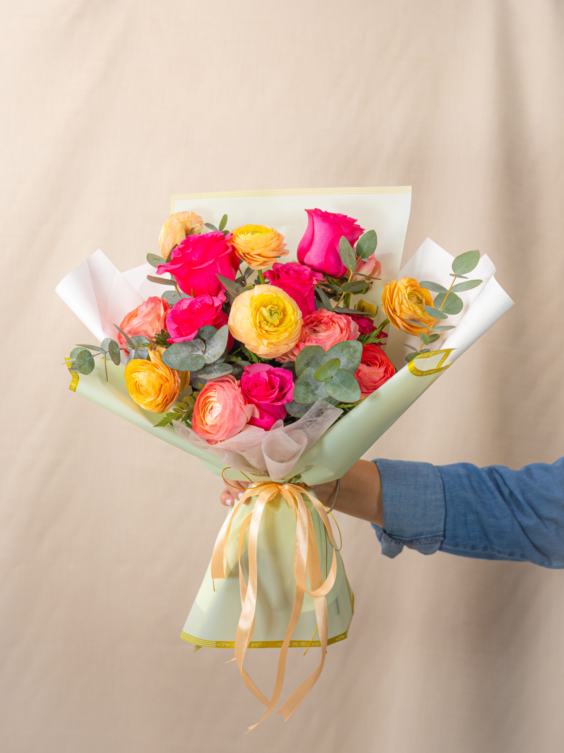 Cada diseño combina 6 rosas cuidadosamente seleccionadas con ranunculus sedosos y delicados, realzados con eucalipto aromático que aporta textura, movimiento y un toque natural.