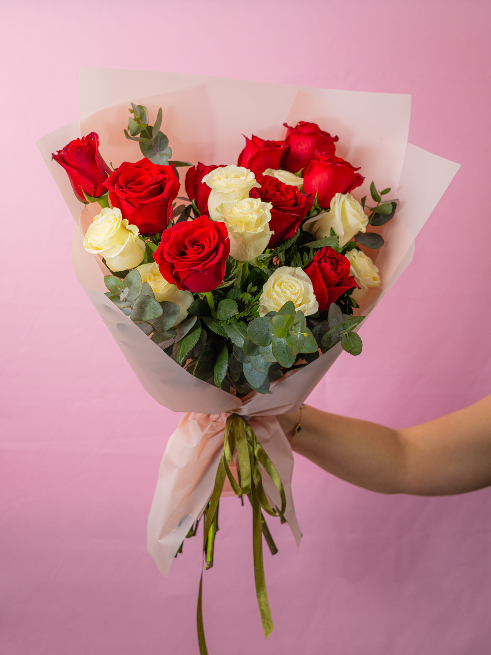 Elaborado con una combinación de 18 rosas naturales y frescas en tonos rojos y blancas, acompañadas de follajes premium, cuidadosamente seleccionadas por nuestros floristas.