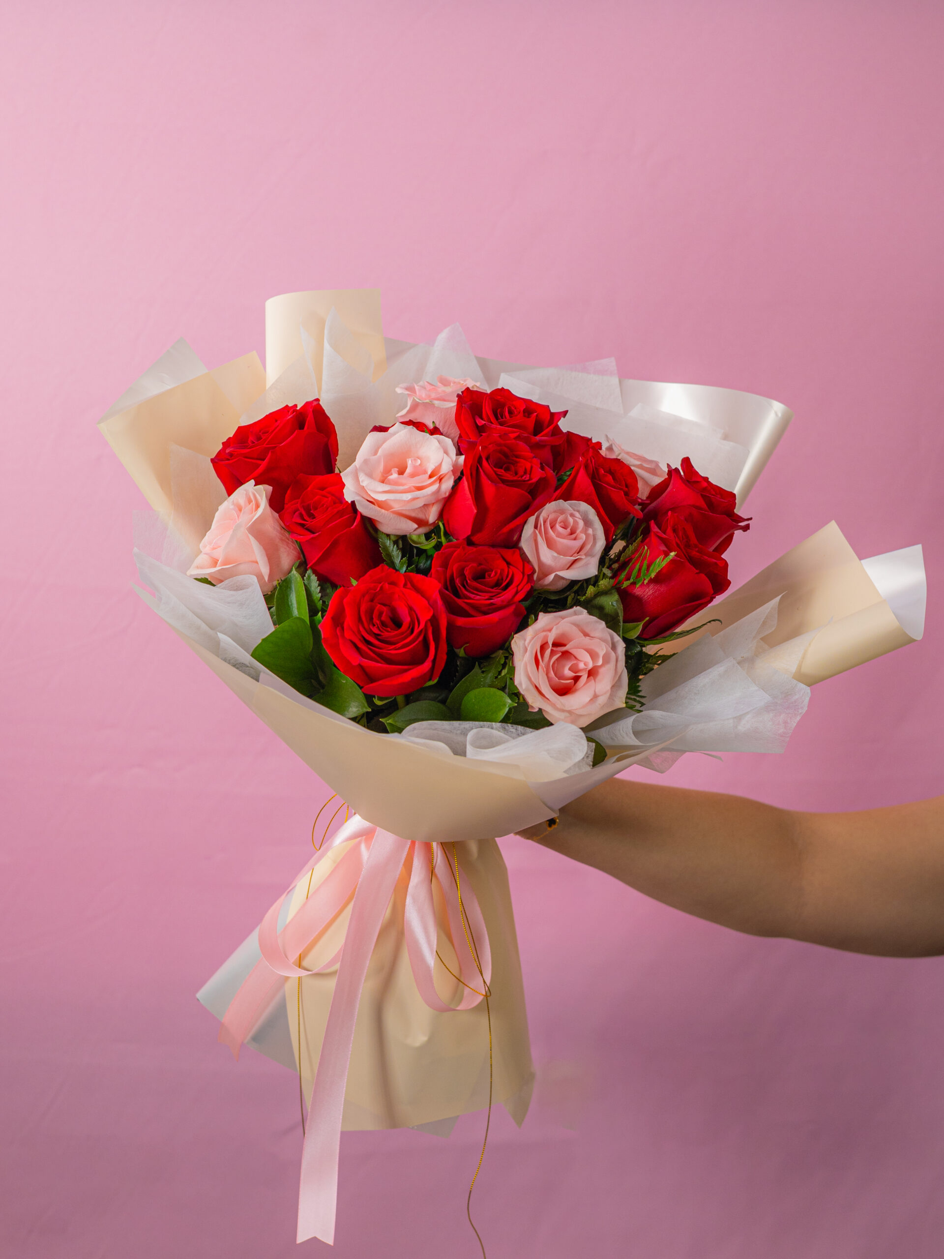Elaborado con una combinación de 18 rosas naturales y frescas en tonos rojos y rosados, acompañadas de follajes premium y una envoltura estilo coreano cuidadosamente diseñada por nuestros floristas.