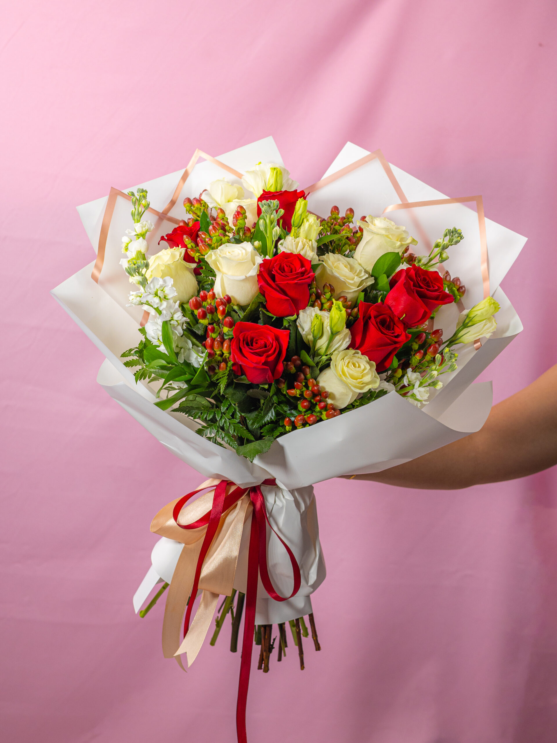 Este ramo está elaborado con rosas rojas y blancas naturales, acompañadas de lisianthus blancos, stock blanco, hipericum rojo y follajes premium, creando un contraste perfecto entre pasión y pureza.