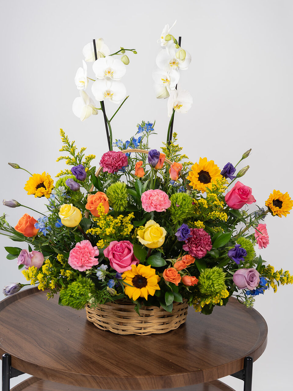 Arreglo elaborado con girasoles y distintas flores en tonos primaverales.