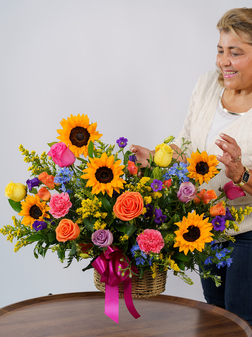 Arreglo elaborado con girasoles y flores en tonos primaverales.
