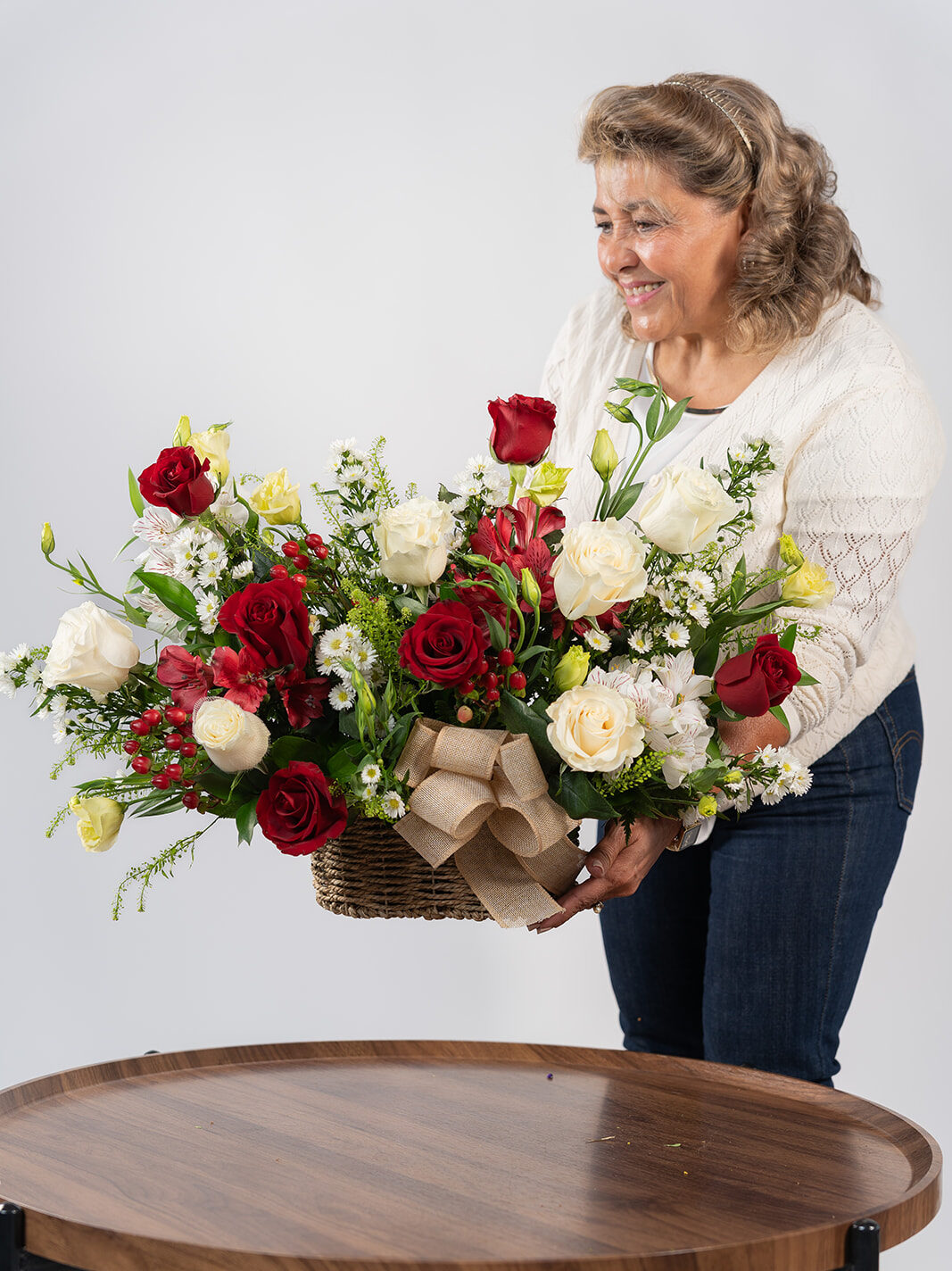 Arreglo elaborar en rosas blancas, rojas y follajes ecuatoriano