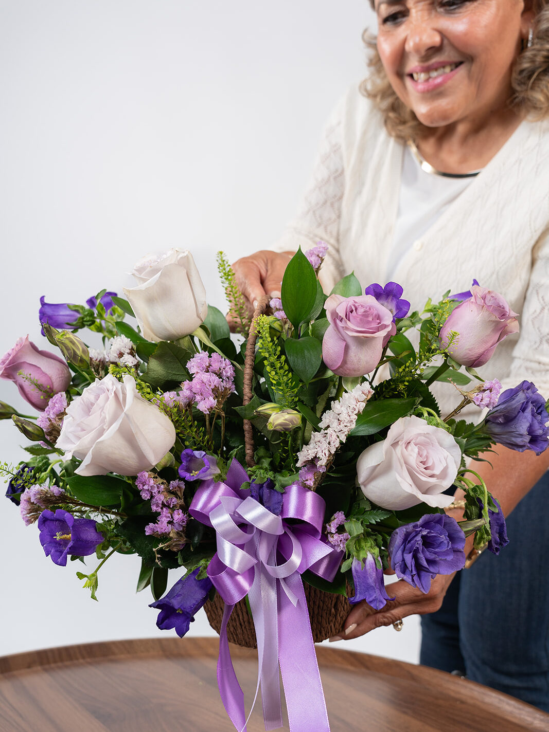 Arreglo elaborado en tonos rosas moradas y follajes