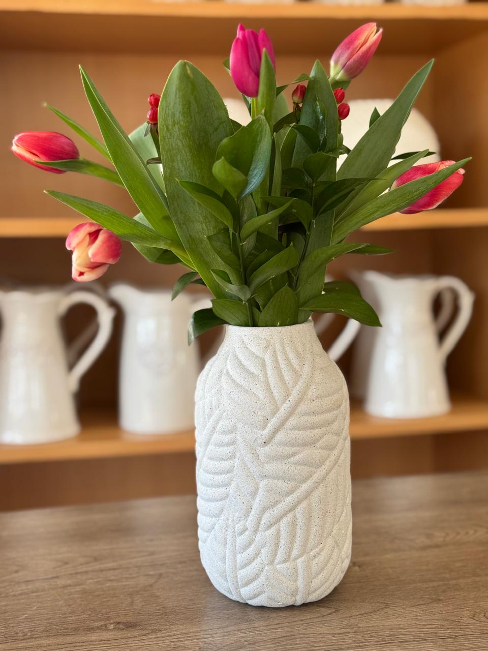 Arreglo floral con tulipanes y follajes verdes, presentado en base de porcelana blanca texturizada. Color de tulipanes según disponibilidad