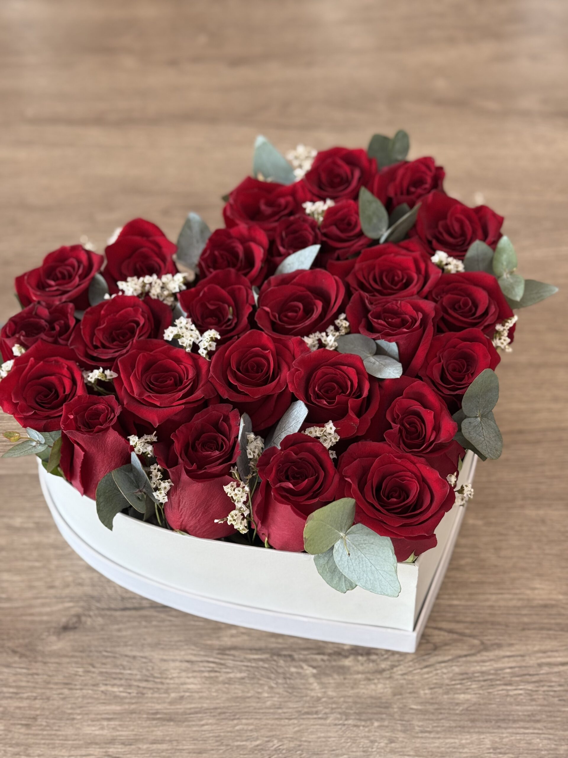 Hermoso arreglo de rosas rojas en elegante caja en forma de corazón, acompañado de delicado follaje verde y pequeñas flores blancas. Un detalle romántico y sofisticado, perfecto para expresar amor y sorprender en cualquier ocasión especial. 🌹