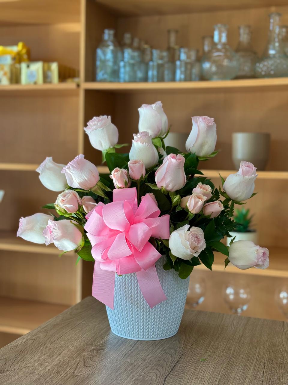 Arreglo en combinación de rosas en tono rosado pálido (según disposición) Base en acabado tipo cerámico, elaborado con melamina blanca.