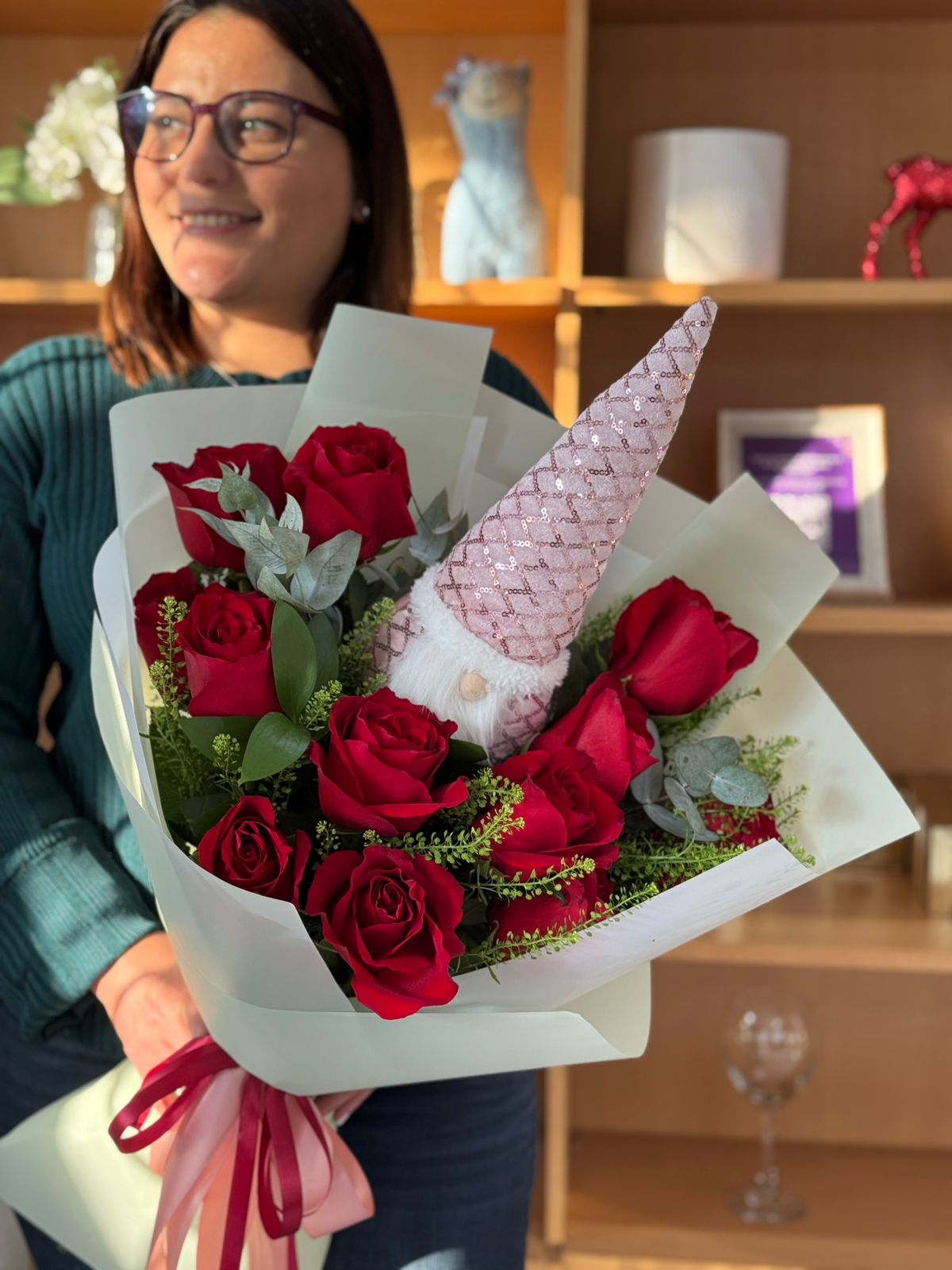 Ramillete de rosas rojas acompañado de follajes frescos y un delicado detalle navideño que aporta calidez y encanto. Un gesto sencillo y especial para regalar amor y espíritu de temporada 🎄✨