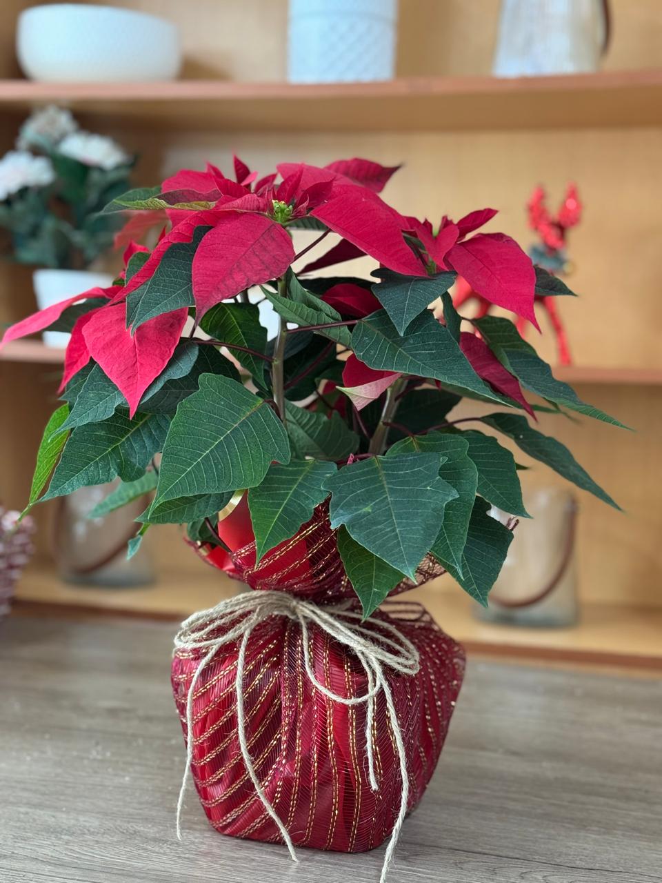 La tradicional flor de Navidad en su versión más elegante. Presentada en base envuelta con tela festiva y lazo rústico, perfecta para regalar o decorar con calidez y estilo.